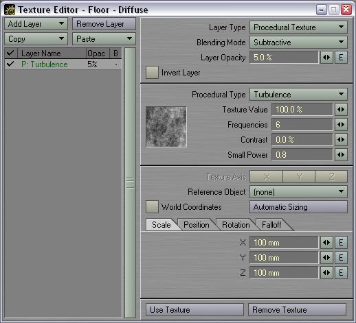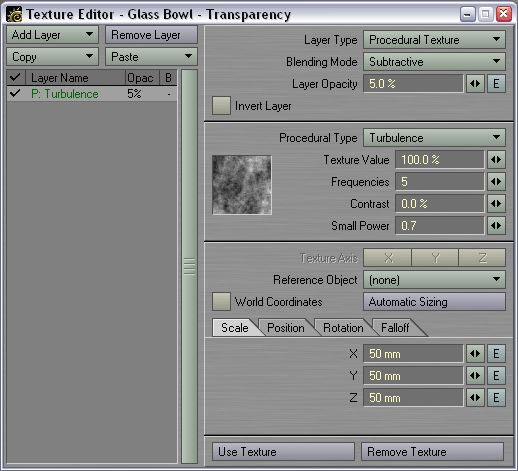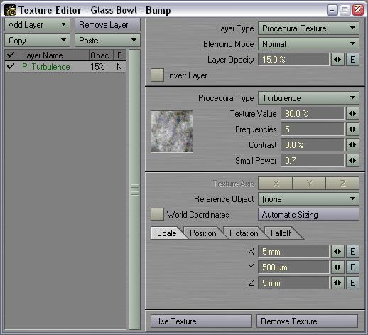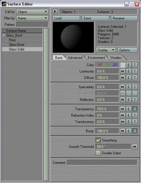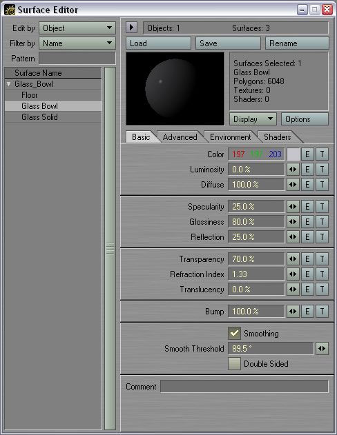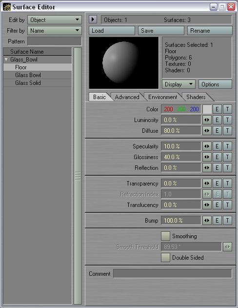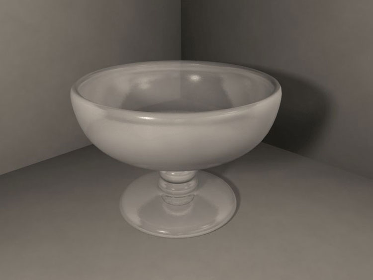 Picture 50: The first test render So lets get on with those materials. Open up the Surface Editor, select the Floor Surface and use the following Basic settings. We are going to add a fractal pattern to this surface, so click the "T" for the Diffuse Channel and use the following settings. Now since we're using 5% for Layer Opacity here, it won't be strong at all. Click Use Texture once you're done, and that's it for the Floor Surface. Next is the Glass Surface, so select it from the list and use the following Basic settings. We are going to add two procedural textures for this surface, so click the T for the Transparency Channel and use the following settings. This will add some variation to the transparency, but a very subtle one since the Opacity is set to 5%. Click Use Texture once you're done. Lets add some bump to, click the T for the Bump Channel and use the following settings. Just click Use Texture when you're done to save these changes. That's pretty much it for the Glass Surface and now we only have one surface left, the Glass Solid one. This will be quite easy, because we're just going to copy the Glass Surface, paste it to the Glass Solid one and just change it around a bit. Keep the Glass Surface selected and double-click the 3D preview of the texture, this will copy the texture to the Presets Panel. If you look in the Presets now, you should have the Glass Bowl Surface under the Workspace Category. Now switch to the Glass Solid surface in the Surface Editor, then double-click the Glass surface in the Presets Panel to load it in. We are going to keep the two texture channels, so just change some of the Basic settings to the following. Well that's it for the surfacing part! Looking through the Cameras eyes, the scene should now look something like picture 57. Now, click the "File" pull-down menu button at the top left of Layout. We are going to save both the objects and the scene, so first select "Save -> Save All Objects", and then select "Save -> Save Scene". Choose a place and a name for the scene file. Now all we need to do is render this image. Open up the Camera Properties once more, this time change the Antialiasing level to Enhanced Medium, then close the Panel down. In the Render Options Panel, click the "Output Files" Tab and then click the Save RGB Button. Choose a name and a location for the finished render and click OK. Also make sure you change the Filetype for the output image, I set mine to JPG. Once done just close down the Render Options Panel and once again save the scene file, then press F10 to render the image! I hope the result of the render was satisfying and above all I hope that you learned something from this Guide and Tutorial. The Final Result can be seen below: Download this Tutorial as PDF Document Author: Erik Brimstedt |