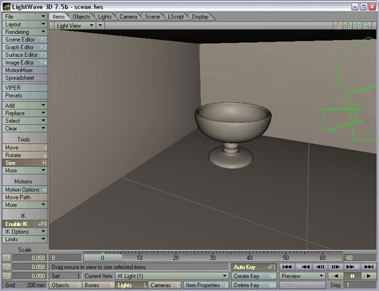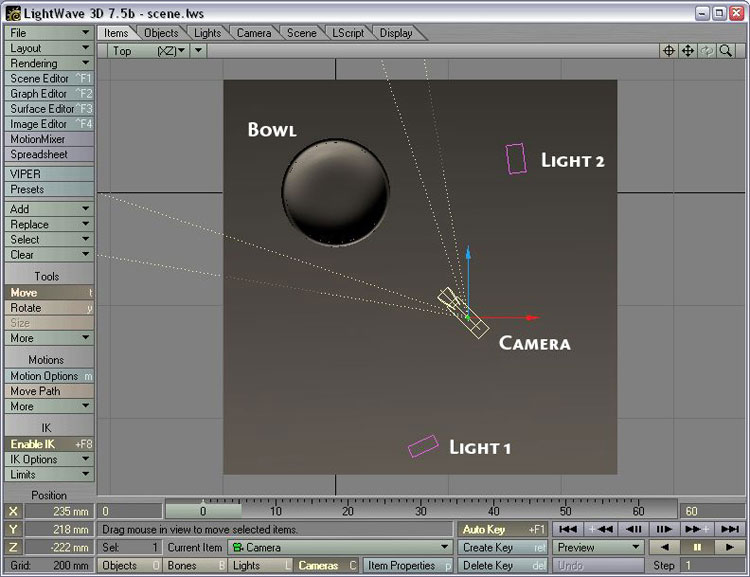 This will rotate the Camera; hit "Enter" again to create a keyframe, so that Lightwave will remember the Rotation we just made. Finally open up the Properties Panel for the Camera and change the Zoom Factor to 2.5, this will make the camera seem more focused on the bowl. Adjusting the Light Activate the "Lights" Item at the bottom of Layout, then hit "p" and the Properties Panel should come up. Use the following settings for the light.