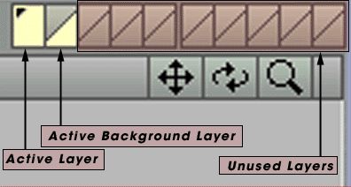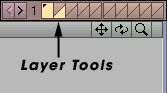 Picture 10: The Layer Tools The one to the very left is lit up with a yellow colour, which means that it is active. As you can see there's a little black dot in this Layer. Remember the Box we created earlier? Well, the little black dot indicates that this layer has got an object in it. If you look at picture 11 you will see that each of these boxes is divided in two. The Top part indicates Foreground Layer, and the Bottom part indicates Background Layer.