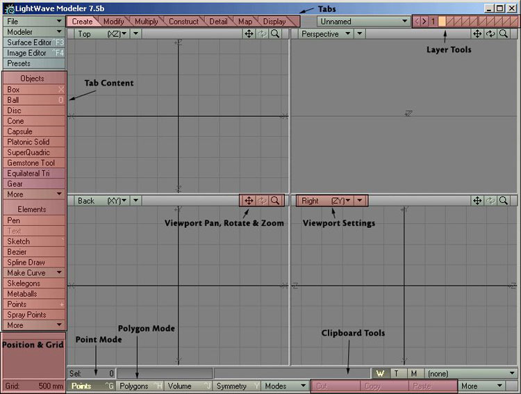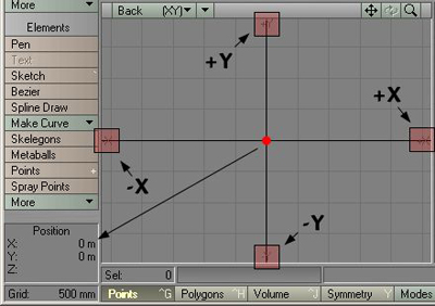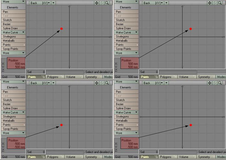 The red dot in the middle of the View indicates the centre of the Universe, and as you can see in the Position window, the values are both zero there. The picture also shows that each axis has got a negative and positive side. In my example I'm using the "Back" View, or the Bottom Left Viewport, and this viewport shows the X and Y axis. Left of the vertical centre line you have the negative X, and on the right you have the positive X. Below the horizontal centre line you have the negative Y, and above you have the positive Y. Does it sound hard? Well, I've made a few pictures to ease things up a bit. Picture 14 shows 4 different positions for the mouse pointer, which is indicated by the little red dot. Note that the Grid Size is set to 500mm, and therefore each square in the grid pattern indicates 500x500 millimetres of space. All of the views in picture 14 show the Back View (Bottom Left Viewport), and you can try this out yourself by just moving your mouse pointer in the Viewport. There you have some information on how Modeler is built up and how things work in general. We will now start the main Tutorial, and while we go along we will do a few smaller tutorials on the tools we use etc. Author: Erik Brimstedt |