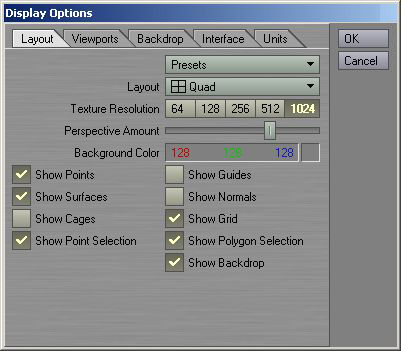 As you can see in Picture 1, there's a point in each corner of the box. Picture 2 on the other hand shows the Polygons, and these are the ones you give materials to, and they are the ones you will see in the final render. I guess you already knew that 3D stands for 3Dimensional, and this is what you work with in any 3D program out there. In Lightwave, these Dimensions are called X, Y and Z, and these could be described as Left/Right, Up/Down and Near/Far respectively. What's the advantage of using a 3D program then? Well, you can create nice artwork by drawing them in a 2D program, but when it comes to animating what you've created it becomes a bit harder, and this is where the 3D program has an advantage. Another thing to mention is that you can change anything in the pictures you create. If you didn't like the material on a certain object, or if the light setting was wrong, just change it and re-render. That'll do for an introduction; lets get going with Lightwave! The Basics of Lightwave Follow the installation instructions and install Lightwave on your harddrive. Lightwave comes as two separate programs, Lightwave Layout and Lightwave Modeler, and from now on they will just be referred to as Layout and Modeler. Lightwave Layout If you start Layout up it should look something like picture 3. This is where you load objects you've created, give them textures, edit lights & cameras, animate things and render your final pictures. As you can see I have added a few descriptions on some of the items in picture 3. However, we will not start the tour in Layout, but we will get back to it later on in the Guide. Lightwave Modeler If you load Modeler up, it should look something like picture 4. The Modeler lets you model all the necessary objects you need for your scene. You also prepare your objects for Layout here, like attaching surfaces to them etc. I put a few descriptions on picture 4 as well, and we will get to know the interface better next. Getting to know Modeler We'll start with a few explanations on how Lightwave is built up, and then we'll start the main tutorial and learn the tools we use as we go along. The Interface & Workflow The Workflow is one of Lightwave's stronger areas. If you look at the Interface, you'll see that every Tool or Button is named with text. No image buttons that takes ages to learn, plus that the interface is very clean. You also have shortcuts on your keyboard for almost every Tool in Lightwave. The menus are also configurable and you can create your own menus to fit your own needs. Keyboard Shortcuts If you look at the "Box" Tool button in the "Create" Tab, you'll see that in the right side of the button there's an "X". This means that a capital X is the shortcut key for the Box Tool, so if you hit "shift+X" on your keyboard, you'll see that the Box Tool gets activated. This is how it works with all the other Tools that have a key assigned to them as well. If you would like to assign a shortcut to a Tool that perhaps doesn't have one, hit "alt+F9" on your keyboard and you will get a list over all the Tools available, and a list over all the keys on your keyboard. You can also access certain setting panels from the "Modeler" pull-down menu at the top left of Modeler. Plugins Lightwave comes with lots of Plugins that you need to get things working properly. We will start by installing these in Modeler. At the top left of the Modeler window, you should see a button named "Modeler". If you click this one with your Left Mouse Button, you will get a small menu with a few sections and options. One of the sections is named "Plug-ins", so click that one and a sub-menu will appear. From this sub-menu, select "Edit Plug-ins". A Panel will appear and this is where you control your Plugins. If you didn't install your Plugins already, we will do it now. Click the "Scan Directory" button on the right of this Panel, and a browser window will appear. Browse to your Lightwave Directory (on your harddrive) and find the Folder named "Plugins", simply just mark this Folder and click OK. Lightwave will now install all the Plugins it will find automatically. When it's done you can simply close down the Plug-ins Panel. Display Options Modeler has got four Viewports by default. Each of these Viewports can have their own unique settings. Open up the Display Options panel by hitting "d" on your keyboard, it should look something like picture 5.