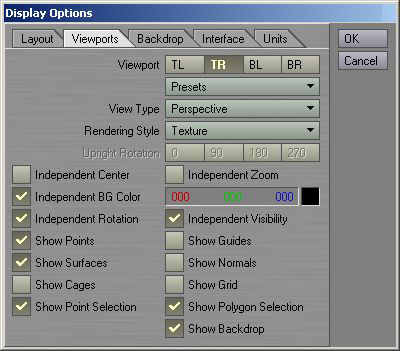 Picture 5: Display Options Panel The first tab called "Layout" in this panel contains a few global settings. This means that if you change something here it will take place in all of the Viewports. As you can see I've turned off a few options here, and this is just my own preference. What we will change though, is the Top Right Viewport (Perspective View) and how that one should appear. So to edit just one of the Viewports, click the "Viewports" Tab. The first thing to do here is choose which of the Viewports we want to edit, so click on the "TR" (Top Right) button to select that one, then use the options that picture 6 are showing.