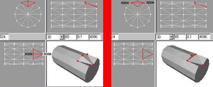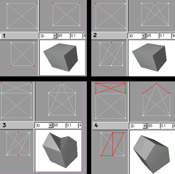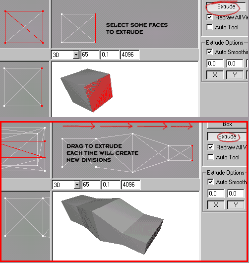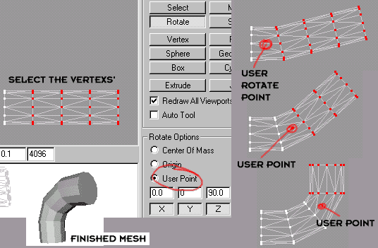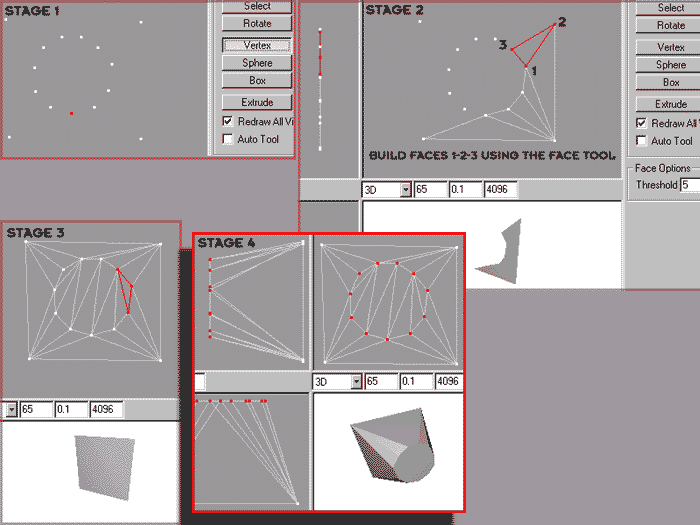 AXIS EXPLANATIONThis is just a brief exlpantion of the different AXISsses :) OK, X is across(horizontal) and Y is up (vertical) like on a graph, Z is into/out of the screen in the front view, its forward and backwards relative to your model. When you move things you can restrict which axis are affected, like I disable Y (vertical movement) so when I move stuff it doesn't move up/down. ![]() HIDING STUFFCTL H hides whatever is selected, CTRL U unhides all. When first using milkshape I found that when I selected vertices/faces I always selected the ones I wanted plus a load on the other side I didn't :) NOW I simply hide what I dont want affected, select the vertices that you dont want, CTRL H to hide em, now just work on the ones that are visible. I USE THIS CONSTANTLY!!!!. SELECTING THINGSSHIFT LEFT CLICK adds to your selection, SHIFT RIGHT CLICK remove from your selection. OK when selecting stuff I also select too much, then remove the things I dont want by SHIFT RIGHTCLICKING and dragging a box around the stuff I dont want selected. In this example I select a load of verts, as you can see the front and back ones are selected. SHIFT RIGHTCLICK DRAG a box around the ones I dont want and that leaves the ones I do! I ALSO USE THIS CONSTANTLY!!! MOVING THINGSSelect whatever you want to move, in this example I wanted to move the verts horizontally and definately not vertically, so in the move options I de-click Y and Z, leaving X restricting movement to that axis, easy eh? Wanna move something vertical only, declick X and Z and click Y, now you can only move up an down, useful for keeping things in line accurately. ROTATINGSelect a load of verts, now Rotate but click USER POINT first, they will rotate around where you click and hold the mouse, extremely useful, otherwise you end rotating, then moving, rotating, then moving etc. In the example I created a cylinder, rotated the points, deselected some points rotate a bit more, deselect more points and rotate some more. CREATING VERTICES AND FACESOne thing to remember when vertex modeling is to try and plan what your going to need, this is why its best to sketch your concept first and give it plenty of thought. OK now, in the example I have plotted a square with a circle within with the vertex tool, now I build the faces 1,2,3 clockwise or anticlockwise depending on which way you want the faces to face, check the 3d view to see your progress. Select the vertices on the circle and in the side view move them, giving the flat plane depth and as you can see you get a square changing to a circle :) EXTRUDINGSelect some faces as I have coloured in the example, the click the extrude tool, now in the side view drag the faces out, each time you do a new extrusion is created, now you can scale as you go along or simply select the vertices later and scale,rotate or move them accordingly. TURN EDGEAs you can see the selected TWO triangles are joined by a line from one vertex to the other as shown, if we use CTRL E or click Turn Edge they will be connected by the other two vertices as shown in the second pic, a practical example is shown in the next pic.. DIVIDE EDGESelect two vertices and press CTRL P or click divide edge and it will create a new vertex inbetween them allowing you to add more detail where you need it. Also as you can see I drag the new verts upwards and we should have a house shape, but the faces are connected across the lower verts, select the two faces and CTRL E to turn edge now they are connected across the point of the roof. Woohooo! REVERSE VERTEX ORDERI created some verts and also some faces but some are facing the wrong way as you can see the black faces are invisible in a model (holes) but there is a face there its just facing away from you :) So select the faces that are black and click FACE-REVERSE VERTEX ORDER in the menu up top, this will flip em round to the face the opposite way, very useful!. JOINING TWO SIDESWhen modelling its more efficient to build one side of say a humanoid, then flip it for the other side :) So move your half right up to the center line of the vertical axis, (I didn't quite here, but that was for the example only) now select the group or all the faces and click CTLR D or EDIT-DUPLICATE SELECTION, you get a duplicate that is directly over the old one so you cant see it :) now click VERTEX-MIRROR LEFT>RIGHT and you get a mirrored copy. If it was slightly away from the centre line you will get a gap like mine, so move the other side inwards until the centre vertexs of each side are directly over each other, now select all the centre verts (from the front view) and click CTRL W or click VERTEX-WELD TOGETHER and all the centre verts will be welded. Check TOOLS-SHOW MODEL STATISTICS (before and after) and the vertex amount has gone from 74 to 62. Now select both groups and click regroup in the groups tab to make them an item! FILLING IN A HOLEAs you can see we have a hole to fill, select all the vertices that are nothing to do with the hole and CTRL H to hide em, so they dont get in the way. from the front view, I added an extra vert in the centre and moved it into position. Now simply build the faces as before, if you build a face and its black then you went round the wrong way and its facing inwards, go click FACE-REVERSE VERTEX ORDER to flip it and build all the following faces in the opposite direction, ie if clockwise was wrong, build them all anticlockwise from now on. Sorted!!! SNAP 'N' WELDLets give this ball some horns :) I select some faces and extrud em upwards, now select all the verts at the top of one of the horns in tyhe front view, now click CTRL N and then CTRL W (just hold CTRL and press N,W) SNAP and WELD, select the verts in the top of the other and SNAP N WELD again. Snap brings all the selected verts together into one place, they all still exist so you weld them to create just a single vert at that point! Author: www.psionic3d.co.uk |