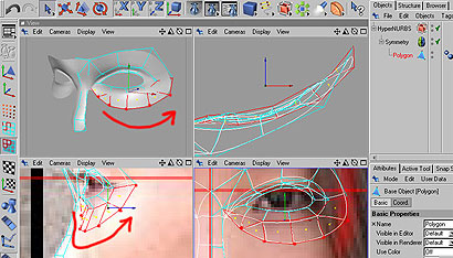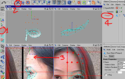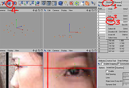 Ok first thing is to add a POLYGON OBJECT the add some points (hold CTRL and click to add points) outlining the eye, I move the points in the side view as well to make them follow the eyelid, then I select all the points 1. click STRUCTURE and 2. COPY and 3. PASTE (copy of selected points) and 4. I SCALE the points up making the outer eyelid, its a quick way of copying points and keeping their shape.
