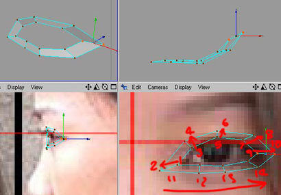 Heres where the BRIDGE tool comes in handy, press "B" and drag 1-2, 3-4,5-6,7-8,9-10 to create all the faces along the top of the eyelid and press ESCAPE to break off face building, then drag 11,12,13,14 to build the bottom faces along the eyelid....