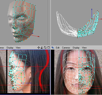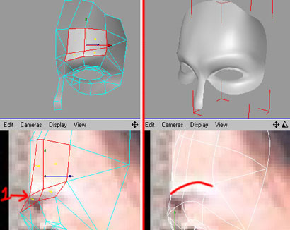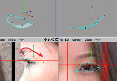 OK now I added some more points under the eye and moved them in both views to try and follow the reference pic, I built the faces using the good old BRIDGE tool and tweaked the points a little more...I also added some points down the nose and built the faces...
