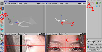 1. Drop the polygon object into the SYMMETRY object and the eyelid will be mirrored, its usually in the wrong place so 2. SELECT the AXIS icon and 3. move the AXIS of the SYMMETRY object to the middle of the face 4. here, this mirrors it perfectly