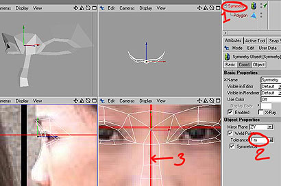 1. Click and 2. Drop in a SYMMETRY object, this will allow me to build one side of the face and automatically mirror and weld the other side....