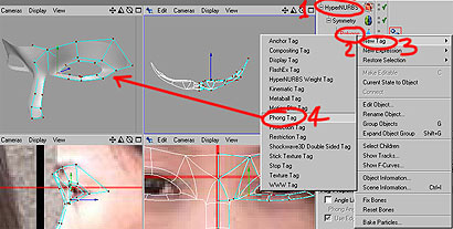 OK I'm constantly dragging the SYMMETRY out of the HYPERNURBS and dropping it back in, this is because the faces are easier to see sometimes when they are not smoothed. 1. I need some more detail in the top eyelid so I Select the faces and 2. I make two cuts using "K" the KNIFE tool, 3. I also weld the points that are close together just to tidy up the mesh, then 4, I move the new points inwards to create a more definate line in the top eyelid....