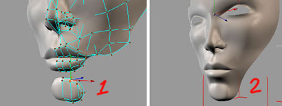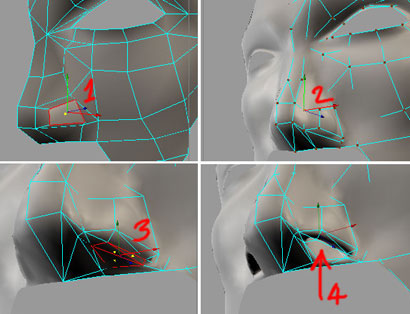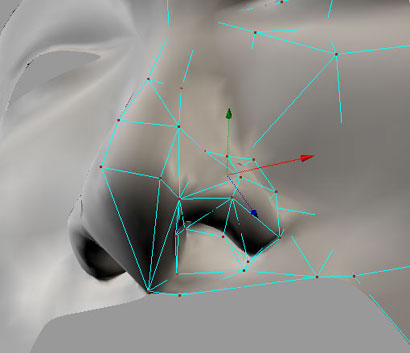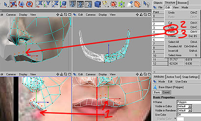 1. I add some more points and build the faces, I move all teh inner points of the chin outwards a bit to give it a bit of depth, and 2. I build some more faces to attach the chin to the mouth/cheeks etc...again more point tweaking as well :)