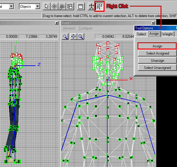LOAD THE MODELI exported the zombie from milkshape as a MILKSHAPE ASCII.TXT file, ready to be imported into CFX. Then click Windows and choose Material editor, you should see a window popup like in the pic below...... ![]() ASSIGNING THE SKIN1. click the Select tool and select the Zombie Mesh, 2. Click Open New Texture and find the zombie.jpg skin, and it'll show up in the Material editor window as shown, you can open several for multi texturing, anyway 3. Click the Assign Texture to assign mesh as shown, and your texture will show up on the model. CREATING THE CENTRAL BONESOK, Now this method is just my method at the moment, its not the best and I will change it to suit various models but for something simple like this, it'll do :) Click the BONES button on the top bar as shown marked in red and click in the front view to create BONE 1 at the base, then bone 2,bone 3 etc... THE bone 1 is so I can rotate the whole zombie and also its good reference for where the floor is. ![]() ADDING THE LEG BONESNow to create the leg bones, I select the SELECT tool and click the bone marked in red, this is where the leg bones will start as you can see in the next pic. ![]() LEG BONESNow click the BONES button again as marked in red, and click 1,2 and 3 to create the leg bones. Now remember to CLICK select again to select the centre bone again, click the Bones button and create the leg bones on the other side. You must select a bone that NEW bones will be joined to(well you dont have to but in this case you do :)) SKELETONI created bones for the arms etc and in the side view I (clicked of Meshes as marked in red so only joints can be selected) moved the bones to match the mesh. make sure you tick meshes again after moving all the bones in the front/side views into the correct positions. Also worth a mention is (as marked in the top left) I change the coords to Local from World so things rotate about themselves etc. BIND THE SKINNow this is the time consuming part and its difficult to explain but I'll do my best with a few examples. First the easy bit click Skeleton>Bind Skin in the menu and your mesh will be attached to the bones. Now click the button marked red, to edit vertex assignments, and also right click it to bring up the options window as shown. Now when I clicked the head bone it showed me which verts were assigned but the ones marked red were assigned to a lower bone for some reason, anyway I selected that bone selected the verts I wanted UNASSIGNED and unassigned them, I then clicked the head bone again and clicked SELECT UNASSIGNED, this gave me the ones on the top of the head, I then ASSIGNED them and all the verts in the head are assigned to the head bone. Now if you go into Animation mode, you can rotate the head bone and the head will move (DONT FORGET TO UNDO AFTER TESTING IT) ![]() THE STUMPAs you can see in this pic the Elbow Bone has all the verts in the lower arm ASSIGNED to it, so this is OK, When we rotate the joint the whole forearm will move. ![]() THE SHOULDERWhen I selected the Shoulder bone I could see that several verts in the body were also assigned to it, this means when the shoulder moves so will these verts creating weird stuff to happen in the body :) Check the next stage to see how to fix it ![]() UNASSIGNINGI selected the bone and also seleted the verts that I wanted UNASSIGNED, using CTRL to add to the selection and ALT to remove from the selection, now I have them selected click UNASSIGN. ![]() ASSIGNING1. I selected the spine bone which I want to assign those verts to instead of the shoulder, 2. click SELECT UNASSIGNED to select those LOOSE verts and 3. I ASSIGNED em to the spine bone instead. Basically the idea is to check each bone and make sure the correct verts are assigned to it, so it moves correctly, I constantly check in animation mode how things look by rotating something then UNDO-ing after seeing how its affected. ![]() LEGI selected the leg and as you can see ALL the lower leg verts are assigned to it, but I want the foot verts assigned to the ankle bone so I can rotate the foot seperately. ![]() UNASSIGNINGI selected the knee bone and the verts in the foot (I unchecked joints so only verts can be selected for the moment) and UNASSIGN by dragging a selection box around the feet verts.. ![]() FOOT ASSIGNNow I select the ankle/Foot bone and 1. SELECT UNASSIGNED then 2. click ASSIGN to assign the foot verts to the foot bone, test it in Animation Mode by rotating and UNDO-ing :) ZOMBIE DANCINGI keep going through each joint and testing things in animation mode then Switching back to OBJECT mode and Unassigning/assigning verts until it all works right, and as you can see above the Zombie is trying open a door with his Stumpy hand or having a bit of a dance :) OK, I seperated this tutorial from the actual animation one cus I thought there was too much for one tutorial, the Walk cycle tutorial is next so look out for it very soon. Hope you found this useful! Author: www.psionic3d.co.uk |