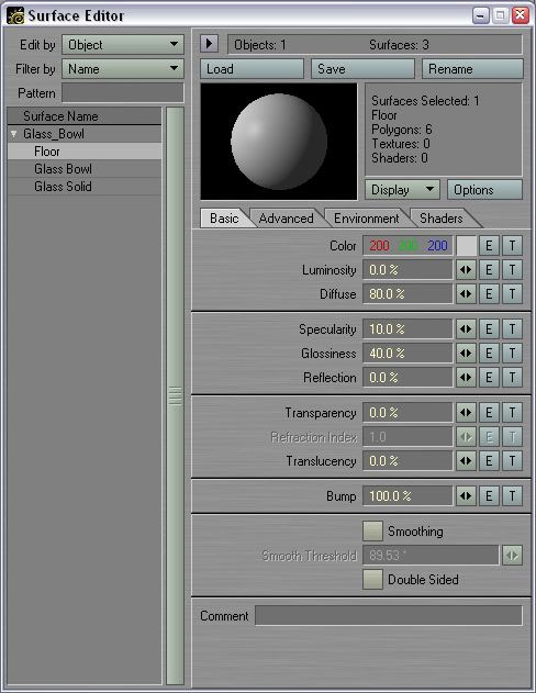 The Editors There are 4 Editors in Layout. "Scene Editor", "Graph Editor", "Surface Editor" and the "Image Editor". These 4 Editors are always available in the Toolbar to the left of Layout; it doesn't matter in which Tab you are. I won't explain the Scene and Graph Editor that much, since they are a bit more advanced with their Tools, but they are generally there to give you more control over the scene, and to help you animate your objects better and faster. The Surface Editor This is where you edit your surfaces. Picture 32 shows the Surface Editor. As you can see to the left, the object name and its surfaces are listed. To the right of that list, you have a real-time preview of the surface that you are editing. You have 4 Tabs with different Tools to alter and change your surfaces. "Basic", "Advanced", "Environment" and "Shaders". The Basic Settings Color lets you set the colour of a surface. Luminosity refers to how much the surface will glow on its own light, remember though that if this setting is on, the object won't appear as a light (won't cast shadows etc). Diffuse lets you choose how much light the surface should attract. High Diffusion will result in that the surface appears bright, and low diffusion will result in that the surface absorbs most of the light and will therefore appear darker. Specularity lets you set highlights on your surface, which is often used on smooth shiny objects. Glossiness will determine how spread out the Specularity is; note that you have to have a Specular value set for this option to be available. Reflection speaks for itself, it lets you change the amount of reflectivity the surface should have. Transparency is a way to make your object go transparent, which is a must when you are creating glass surfaces and such. Refraction Index sets how much the light should bend when it passes through a certain material. Note that you have to have a transparency value set for this option to be available. Translucency is a different kind of transparency. You can't see through a translucent material, yet light can pass through it. Like the shade of a lamp, where the actual light gets through, but you can't see through it. Bump is a way to add bumps to your material. Every real world object has bumps to some degree and this is where you simulate them. Smoothing and Smoothing Threshold lets you smoothen out the polygons on your objects surfaces. Our glass bowl is a good example where the surface should be smooth. When you are creating new surfaces, the best way to get to know the basic settings is to simply try them out one by one. Presets You can save any surface you create for later use, and this is where the "Presets" Panel comes in. In the Tools menu to the left in Layout you should see the Presets button, click that one and the Panel should open up, looking something like picture 33.